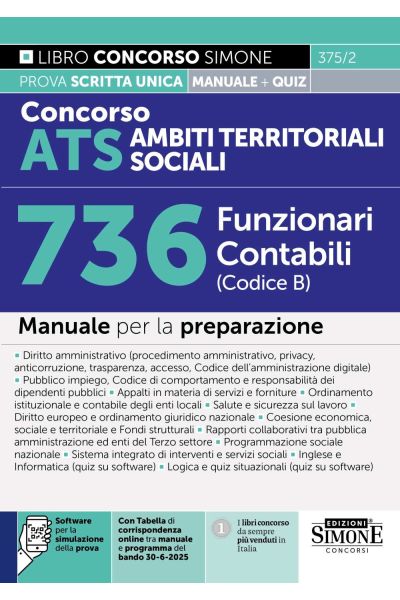 Il manuale Concorso ATS Ambiti Territoriali Sociali per 736 Funzionari Contabili è indirizzato alla preparazione della prova scritta unica del concorso che dà l’avvio alla procedura concorsuale per l’assunzione della figura di Funzionario Contabile destinati a rafforzare gli organici degli ATS.