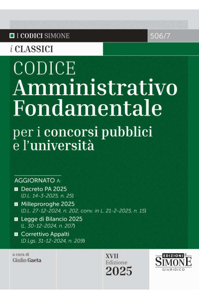 La nuova edizione 2025 del «Codice amministrativo fondamentale» contiene un’attenta e funzionale selezione delle più rilevanti leggi regolanti la materia, aggiornate alle ultime novità normative come il Decreto PA 2025 (D.L. 14-3-2025, n. 25), la Legge di bilancio 2025 (L. 30-12-2024, n. 207), il Correttivo del Codice degli Appalti 2025 (D.Lgs. 31-12-2024, n. 209), il Decreto milleproroghe 2025 (D.L. 27-12-2024, n. 202, conv., in L. 21-2-2025, n. 15) e il Decreto cultura (D.L. 27-12-2024, n. 201, conv., in L. 21-2-2025, n. 16).