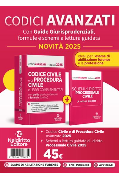 Il Codice civile e di procedura civile Avanzato, con guide applicative, formule e schemi a lettura guidata, Neldiritto Editore 2025, si rivolge ad avvocati, esperti del settore e a quanti devono sostenere l'esame di abilitazione alla professione forense.