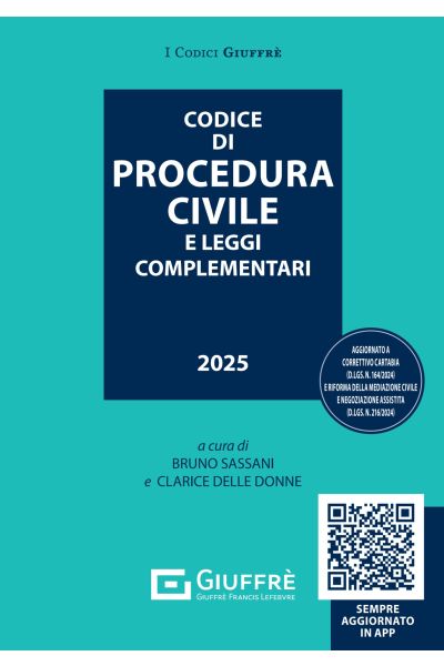Legge di bilancio 2025 (L. 30 dicembre 2024, n. 207); Nuove disposizioni in materia di lavoro (L. 30 dicembre 2024, n. 203); Nuove disposizioni in materia di mediazione civile e commerciale e negoziazione assistita (D.lgs. 27 dicembre 2024, n. 216); Decreto “giustizia” (D.l. 29 novembre 2024, n. 178); Correttivo alla riforma Cartabia del processo civile (D.lgs. 31 ottobre 2024, n. 164); Correttivo-ter al Codice della crisi d’impresa e dell’insolvenza (D.lgs. 13 settembre 2024, n. 136); Decreto PNRR (L. 29 aprile 2024, n. 56, di conversione del d.l. n. 19/2024). Le disposizioni del Codice civile e delle leggi complementari, nel cui elenco si annoverano i recenti stralci rilevanti per ciascuna voce, sono annotate con i testi previgenti delle norme di più recente emanazione e con specifici richiami alla normativa correlata.