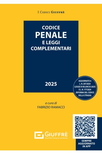 Legge di bilancio 2025 (L. 30 dicembre 2024, n. 207); Delega per la riforma del Codice della strada (L. 25 novembre 2024, n. 177); Nuove disposizioni in tema di reati tributari (D.lgs. 14 novembre 2024, n. 175); Decreto “flussi migratori” (D.l. 11 ottobre 2024, n. 145, conv. in l. 9 dicembre 2024, n. 187); Rafforzamento della tutela in tema di reati informatici (L. 28 giugno 2024, n. 90). Le disposizioni del Codice penale e delle leggi complementari, nel cui elenco si annoverano i recenti stralci rilevanti per ciascuna voce, sono annotate con i testi previgenti delle norme di ultima emanazione e con specifici richiami alla normativa correlata.