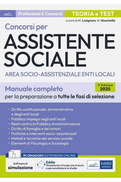Il testo, aggiornato alle più recenti novità normative, parte dalle discipline di base (diritto costituzionale, regionale, amministrativo, ordinamento istituzionale e funzioni degli enti locali, pubblico impiego negli enti locali, reati contro la P.A., diritto di famiglia e dei minori) e prosegue con le discipline specialistiche dell'area socio-assistenziale (legislazione nazionale e regionale in materia di politiche socio-assistenziali, teoria e metodi del servizio sociale, politiche e interventi socio-assistenziali, elementi di psicologia e sociologia). Per ogni sezione sono presenti test a risposta multipla (tra le estensioni online) per la verifica degli argomenti studiati. In omaggio il software di simulazione per esercitarsi online. Inoltre, Eddie, il nuovo assistente virtuale EdiSES basato sull’Intelligenza Artificiale, capace di riassumere i capitoli, spiegarti le definizioni chiave e “interrogarti” con una sezione di quiz.