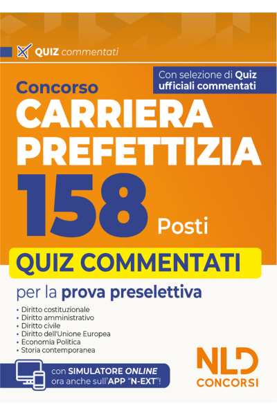 l Ministero dell’Interno ha indetto un concorso pubblico, per titoli ed esami, per n.158 posti per l'accesso alla qualifica iniziale della carriera prefettizia. La procedura concorsuale è articolata in una prova preselettiva, tre prove scritte ed una orale. Il Manuale 158 Carriera Prefettizia. Quiz commentati, NLD Concorsi, 2025 viene incontro alle specifiche esigenze di chi deve prepararsi ad affrontare la prova preselettiva. Il Volume contiene, infatti, quiz con soluzioni commentate sulle seguenti materie: Diritto costituzionale; Diritto amministrativo; Diritto dell'Unione Europea; Diritto civile; Economia politica; Storia contemporanea. Il Volume tiene conto delle principali novità normative, tra cui quelle introdotte dal D.L. 21 maggio 2025, n. 73 (c.d. Decreto infrastrutture) e dalla L. 9 maggio 2025, n. 69, di conv. del D.L. 14 marzo 2025, n. 25 (c.d. Decreto P.A.). I quiz, con soluzioni guidate e commentate, sono per lo più suddivisi per ciascuno dei capitoli di cui si compone il corrispondente Manuale 158. Carriera Prefettizia. Teoria e Quiz,NLD Concorsi, 2025 in modo da consentire di affiancare, allo studio teorico, un mirato esercizio pratico. Il Volume permette, infine, l'accesso ad un'estensione online, consultabile con apposita password, per rimanere aggiornati sulle materie oggetto d'esame e per esercitarsi con il simulatore online.