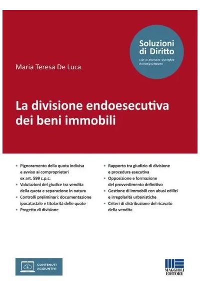 Il volume si propone come strumento operativo per avvocati, professionisti delegati e operatori del settore delle esecuzioni immobiliari che intendano affrontare con competenza le questioni più complesse della divisione endoesecutiva, uno snodo cruciale nell’attuale esecuzione forzata immobiliare. Dalle fasi preliminari del pignoramento alla gestione del giudizio divisionale, dall’intervento degli ausiliari del giudice fino alla formazione del piano di riparto, l’opera guida il lettore lungo un percorso completo e approfondito. Il testo è arricchito da un formulario ragionato e dalla selezione delle pronunce giurisprudenziali più rilevanti, offrendo un valido supporto teorico e pratico all’attività professionale.