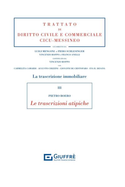 Con questo volume si prosegue la sezione speciale del Trattato Cicu-Messineo sulla trascrizione immobiliare. Vengono trattate le ipotesi di trascrizione con efficacia diversa da quella tipica, che coinvolgono problematiche di grande rilievo e complessità teorica e sistematica e, al tempo stesso, aspetti applicativi di immediata rilevanza pratica. Vengono, così, esaminate, con particolare attenzione ai più recenti orientamenti giurisprudenziali oltre che all’attuale prassi operativa, fattispecie di fondamentale e “trasversale” importanza, quali: la divisione; le varie ipotesi di rapporti patrimoniali di coppia (ivi comprese quelle relative alle unioni civili, alle convivenze, alle coppie transnazionali); gli acquisti per causa di morte; la cessione dei beni ai creditori; l’usucapione e gli altri acquisti a titolo originario; altri atti soggetti a trascrizione (tra cui l’opposizione alla donazione, la rinunzia all’azione di restituzione, i patti marciani di garanzia, gli atti societari, la devoluzione di beni di persone giuridiche estinte, il patto di famiglia, i patrimoni destinati ad uno specifico affare).