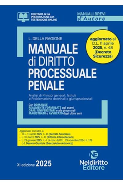 Questa XI Edizione del Manuale breve di Diritto Processuale penale 2025, profondamente rivista nell'impostazione e nei contenuti, tiene conto delle più recenti novità legislative, tra cui quelle introdotte dalla L. 31 marzo 2025, n. 47 (Riforma intercettazioni) e dal D.L. 14 marzo 2025, n. 25 (Decreto Pubbliche Amministrazioni).Tante e assai rilevanti le nuove questioni esaminate, come imposto anche da un vivacissimo dibattito giurisprudenziale, interno e sovranazionale, di cui si è dato ampiamente atto, nel testo e nei numerosi Focus.