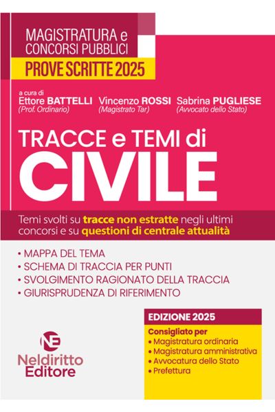 Conoscere bene e approfonditamente le materie non è ancora garanzia di successo concorsuale. È necessario saper stilare un tema, cogliendo le questioni poste dalla traccia, organizzando l'elaborato attorno alle stesse, definendo una "scaletta", assicurando conseguenzialità' espositiva. È un compito difficile tanto più per chi, negli anni dello studio universitario, non si è cimentato in prore scritte, talvolta addirittura regredendo rispetto agli anni della scuola secondaria! I tre volumi Tracce e Temi offrono la possibilità di confrontarsi con elaborati redatti da brillanti vincitori degli ultimi concorsi. Ciascun volume si compone di numerose tracce, di cui 10 selezionate tra quelle "non estratte" negli ultimi Concorsi in magistratura. È un punto di forza dei volumi perché consente di cimentarsi con tracce che le Commissioni degli ultimi concorsi hanno elaborato e inserito nelle terne, su temi peraltro che conserrano una rilevante attualità e probabilità concorsuale. Per ciascuna Traccia, sono indicati i riferimenti normativi di cui tener conto, la "scaletta" con il ragionamento sotteso all'organizzazione che si intende seguire, l'elaborato, i principali indirizzi giurisprudenziali sulle questioni rilevanti.